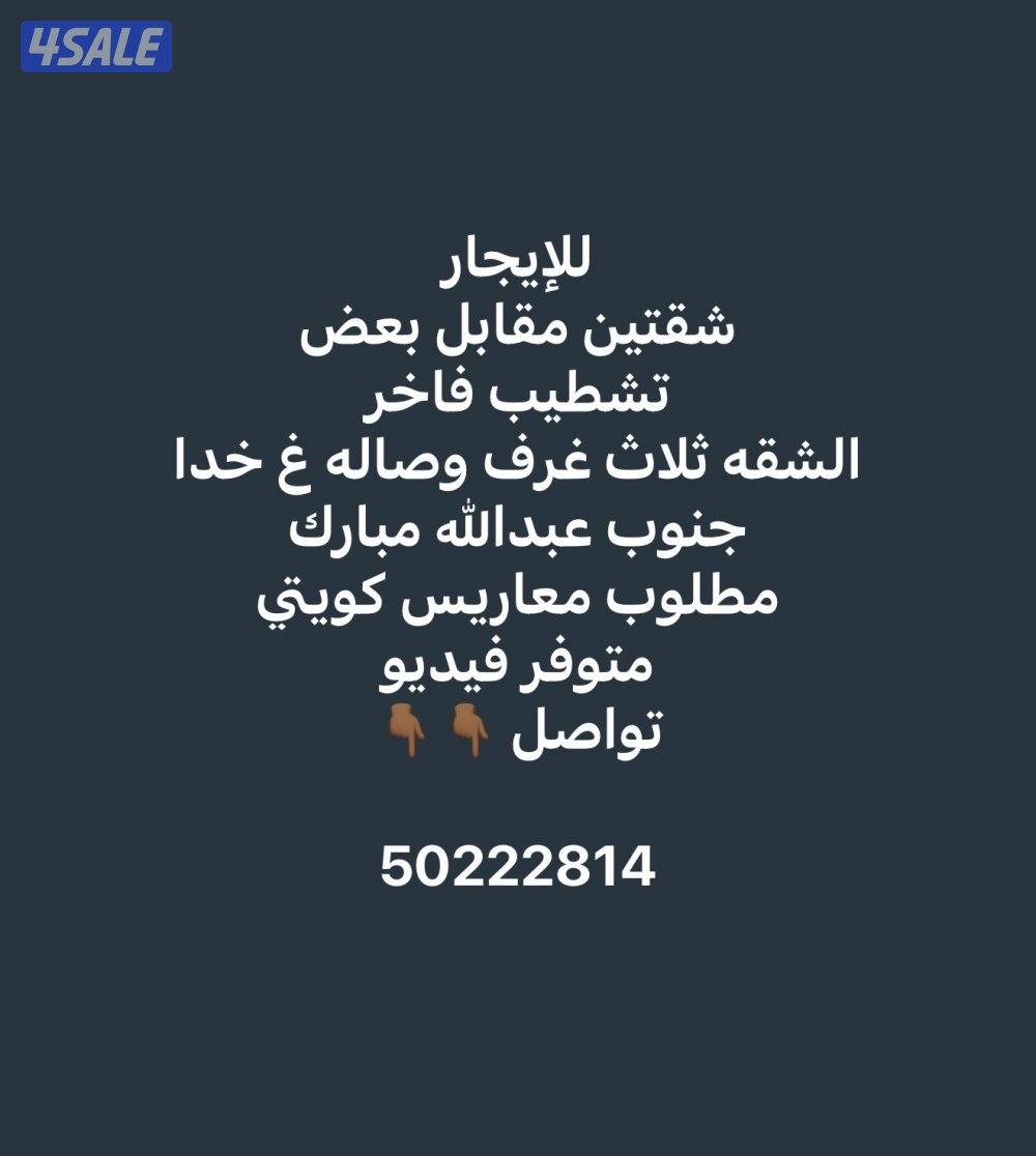 السعر: ٣٥٠ د.ك - للإيجار : شقتين مقابل بعض تشطيب فخم سوبر ديلوكس الشقه ثلاث غرف كبار منهم ماستر صالة معزوله غرفتين بينهم حمام مطبخ كبير جاهز غرفة خدا مع حمام