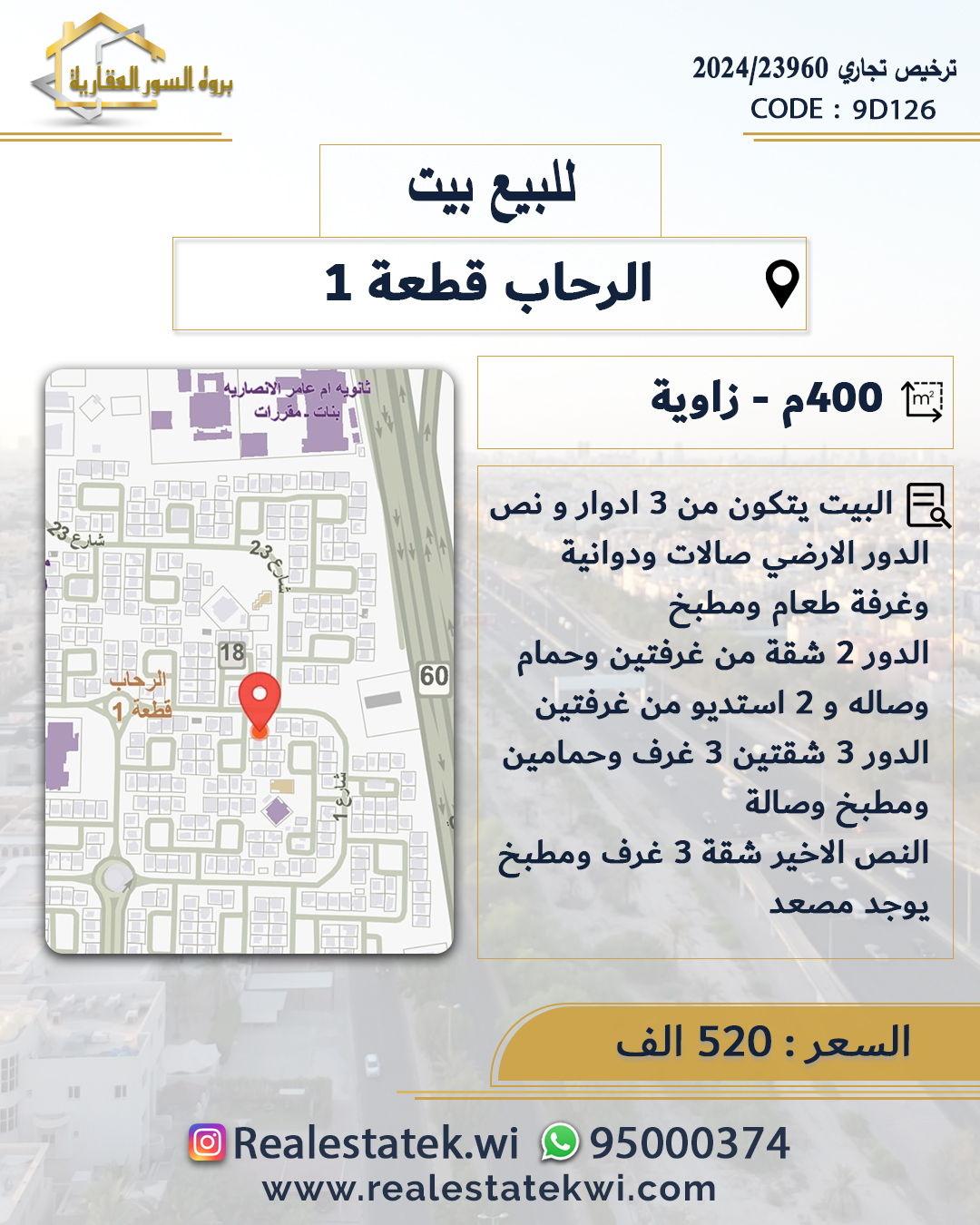 للبيع بيت فى الرحاب قطعة 1 ، مساحته 400 متر مربع ، موقع زاوية بواجهة 20 متر مع إرتداد يتكون من 3 أدوار ونصف حيث يحتوي الدور الأرضي على صالات وديوانية وغرفة طعام ومطبخ والدور الثاني شقة مكونة من غرفتين وحمام وصالة بالإضافة إلى عدد 2 استديو كل استديو غرفتين والدور الثالث شقتين كل شقة تحتوي على 3 غرف وحمامين ومطبخ وصالة أما الدور النص الأخير فهو شقة مكونة من 3 غرف ومطبخ وصالة وحمامين مع وجود غرفة خدم للخدمات يوجد مصعد ومدخل أمامي ومدخل خلفي للمؤجرين وحديقة كبيرة وعدد 12 موقف سيارة البيت مناسب للسكن العائلي أو للاستثمار والإيجارات البناء سنة 2017 وتم ترميمه بالكامل السعر 520 ألف دينار
