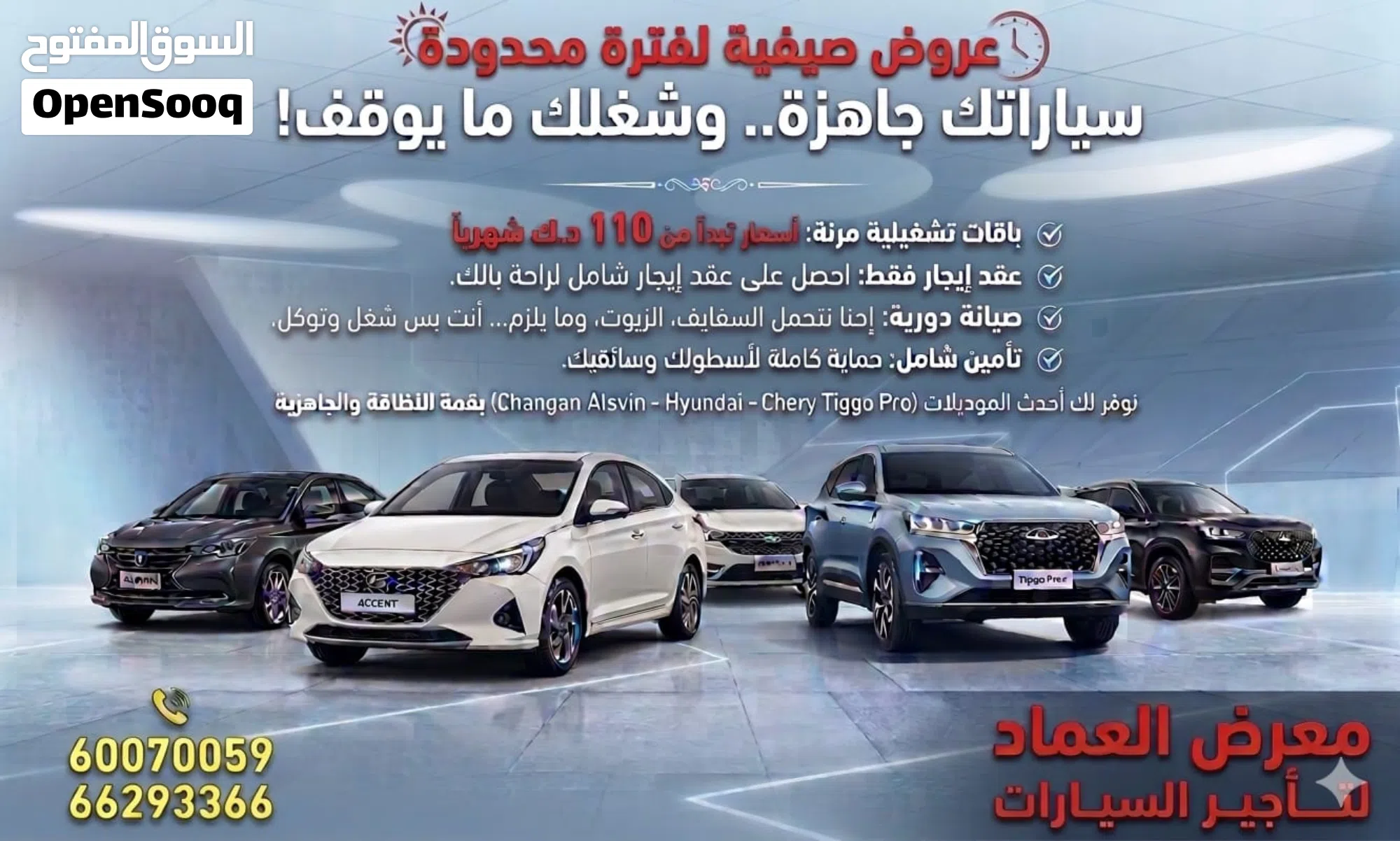 سياراتك جاهزة. وشغلك ما يوقف باقات تشغيلية مرنة: السعار تبداً من 110 دك شورياً عقد إيجار فقط: احصل على عقد إيجار شامل لراحة بالك. صيانة دوريه إحنا تحمل السفايف، الزيوت، وما يلزم.أنت بس شغل وتوكل، تأمين شامل: حماية كاملة لأسطولك وسائقيك. نوفر لك أحدث الموديلات (Changan Alsvin - Hyundai - Chery Tig